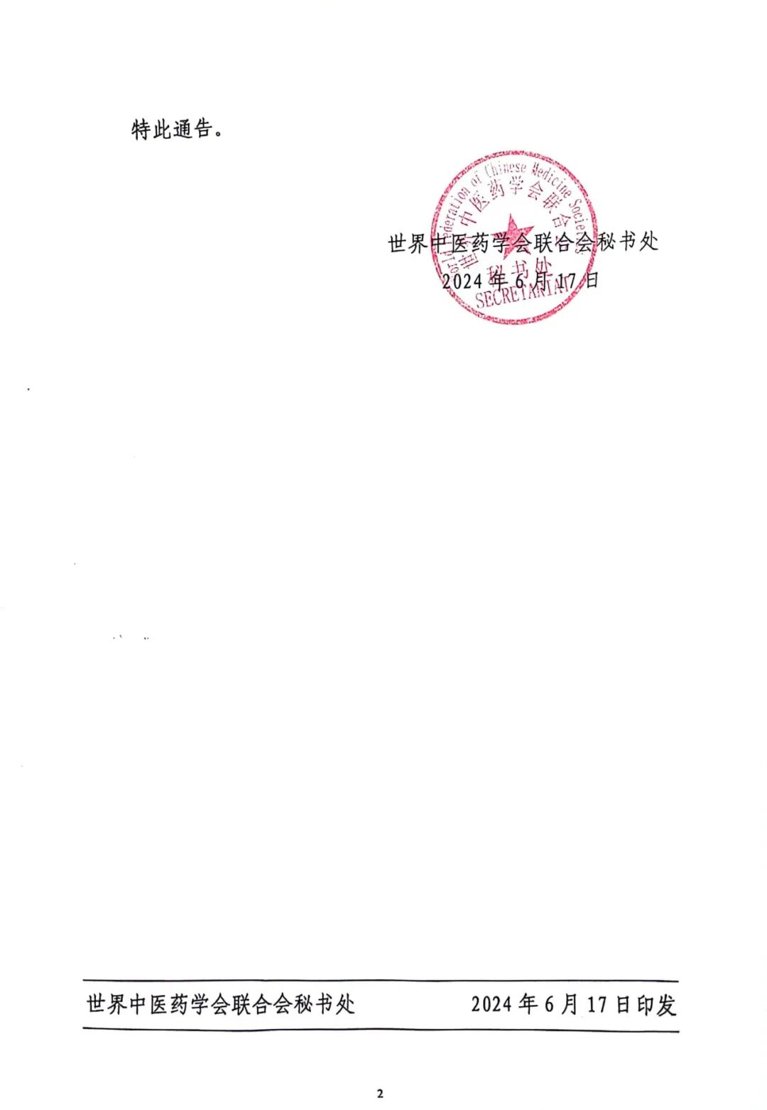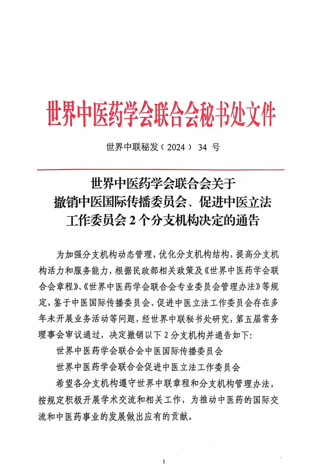 世界中医药学会联合会关于撤销中医国际传播委员会、促进中医立法工作委员会2个分支机构决定的通告
