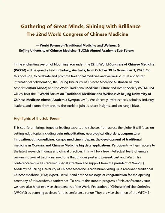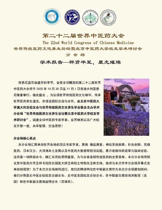 第二十二届世界中医药大会分会场推介——(CN/EN)世界传统医药文化养生论坛暨北京中医药大学校友学术研讨会分会场