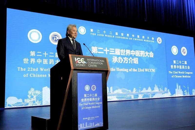 第二十三届世界中医药大会承办方新加坡中医师公会会长吴佳盛报告了第二十三届世界中医药大会的初步构想与筹备进展,并表达了承接盛会的信心与愿景。